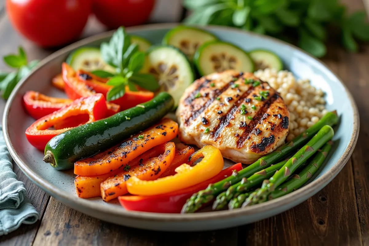- Kolacja: pieczona pierś z kurczaka z mieszanką warzyw.