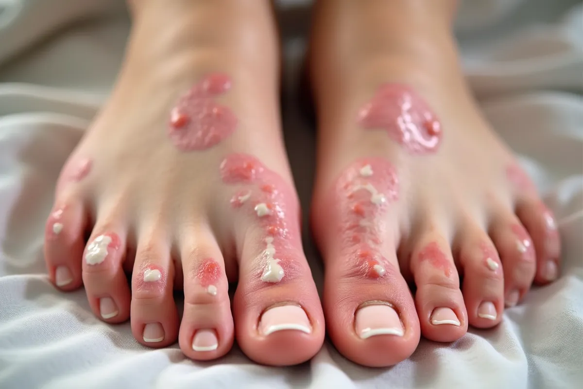 • bolesne rany w przestrzeniach między palcami.